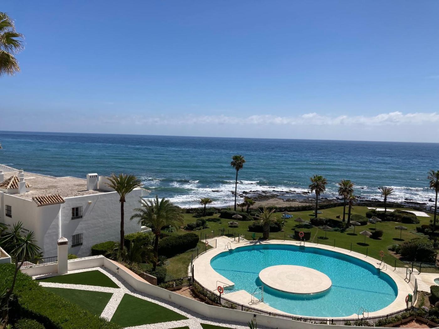 Playa Miraflores - Sea Front Apartment está en Mijas Costa y ofrece una terraza con vistas al mar y a la piscina, además de piscina al aire libre, sauna y bañera de hidromasaje. Este alojamiento se encuentra frente a la playa y tiene jardÃn y wifi gratis.